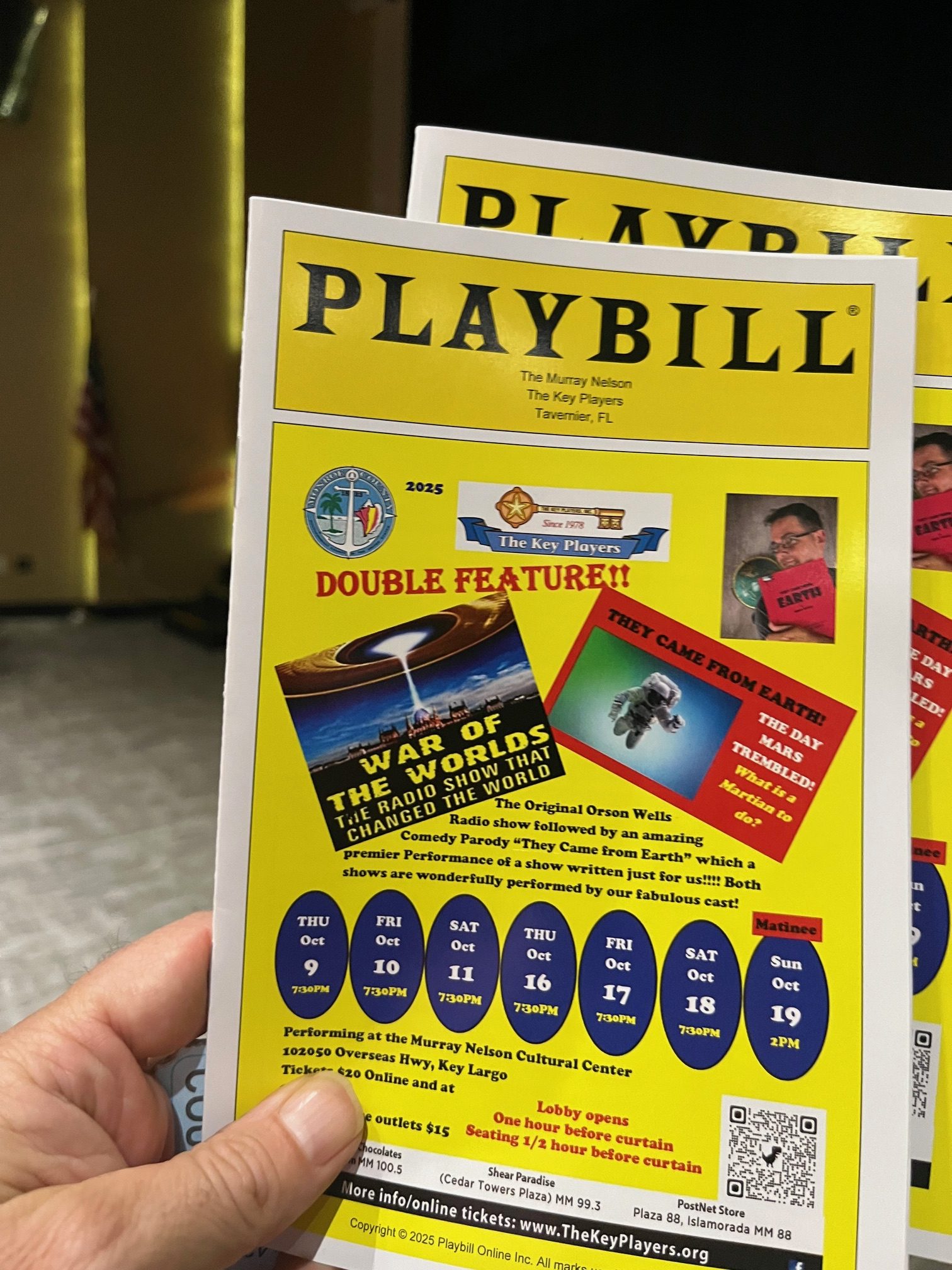 The first act reimagines the classic 1938 Orson Welles radio broadcast that famously sent listeners into a Halloween panic. The second show is a comedy parody written by a local playwright—a fun twist exploring what might happen when Earthlings land on Mars. It’s the kind of clever, community-driven production that makes the Upper Keys so special.